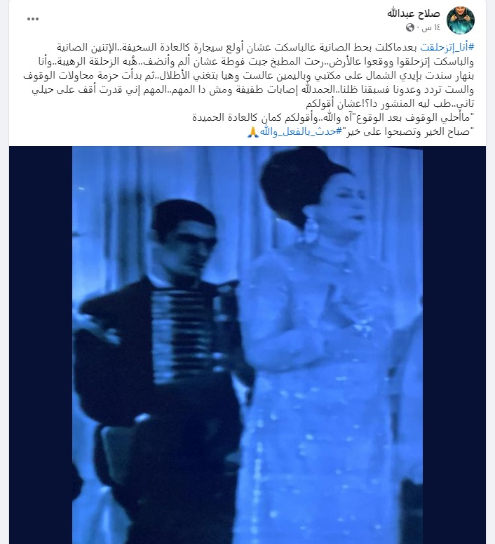 وأضاف صلاح عبد الله: الحمد لله إصابات طفيفة، ومش دا المهم، المهم إني قدرت أقف على رجلي تاني، طب ليه المنشور ده عشان أقولكم ما أحلى الوقوف بعد الوقوع، آه والله وأقولكم كمان كالعادة صباح الخير وتصبحوا على خير.