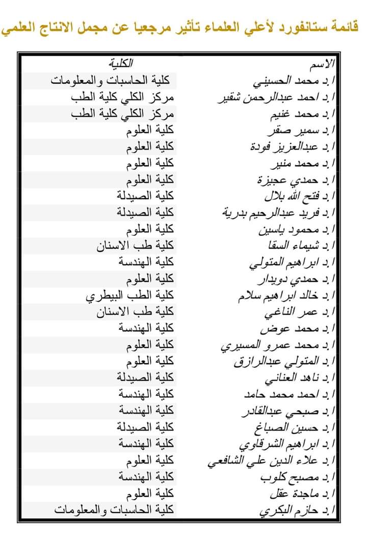 60 عالمًا من جامعة المنصورة في قائمة ستانفورد لأفضل 2% من علماء العالم الأكثر تأثيرًا