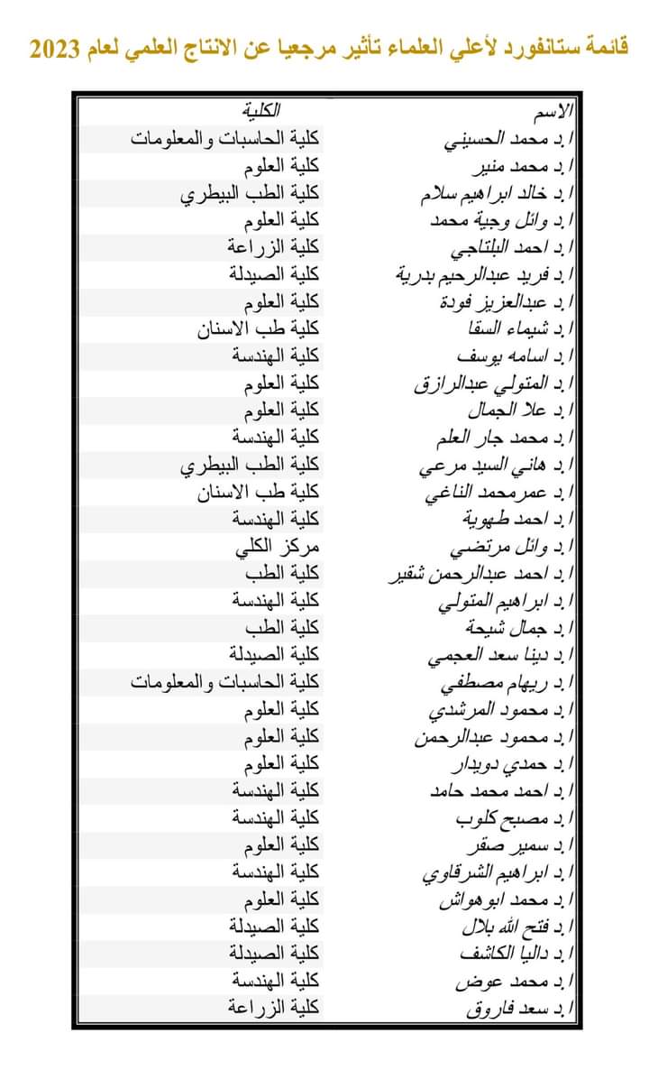 أعلن الدكتور شريف خاطر رئيس جامعة المنصورة، ظهور 60 عالمًا من كليات الطب، الصيدلة، طب الأسنان، الطب البيطري، العلوم، الهندسة، الحاسبات والمعلومات، الزراعة بالجامعة، ضمن قائمة أفضل 2٪ من علماء العالم الأكثر تأثيرًا عن مجمل إنتاجهم العلمي والاستشهادات المرجعية بأبحاثهم العلمية، وفقًا للقائمة الصادرة من قاعدة بيانات Elsevier عن جامعة ستانفورد الأمريكية، والتي شملت 27 عالمًا من الجامعة كأكثر العلماء تأثيرا عن مجمل إنتاجهم العلمي، و52 عالمًا عن أبحاث عام 2023، وبذلك يصبح عدد المنضمين للقائمة 60 عالمًا عن مجمل الإنتاج العلمي وأبحاث عام 2023.