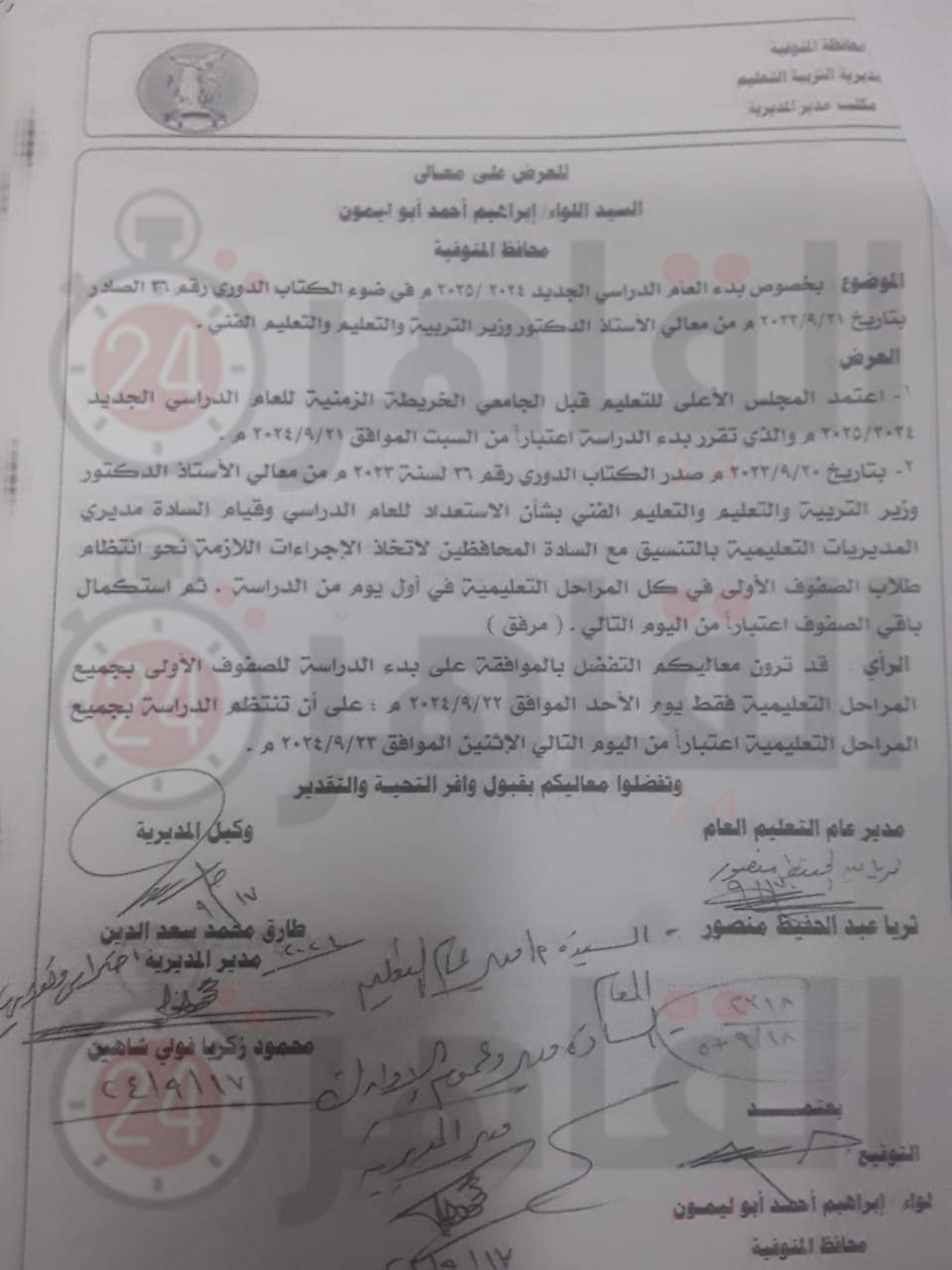 وفي ضوء الاستعدادات التي تقوم بها مديرية التربية والتعليم بمحافظة المنوفية، بالتنسيق من اللواء إبراهيم أبو ليمون محافظ المنوفية، تقرر البدء في انتظام الصفوف الأولى بجميع المراحل التعليمية يوم الأحد القادم 22/9/204، على أن تنتظم باقي المراحل التعليمية اعتبارا من يوم الإثنين الموافق 23/9/2024.