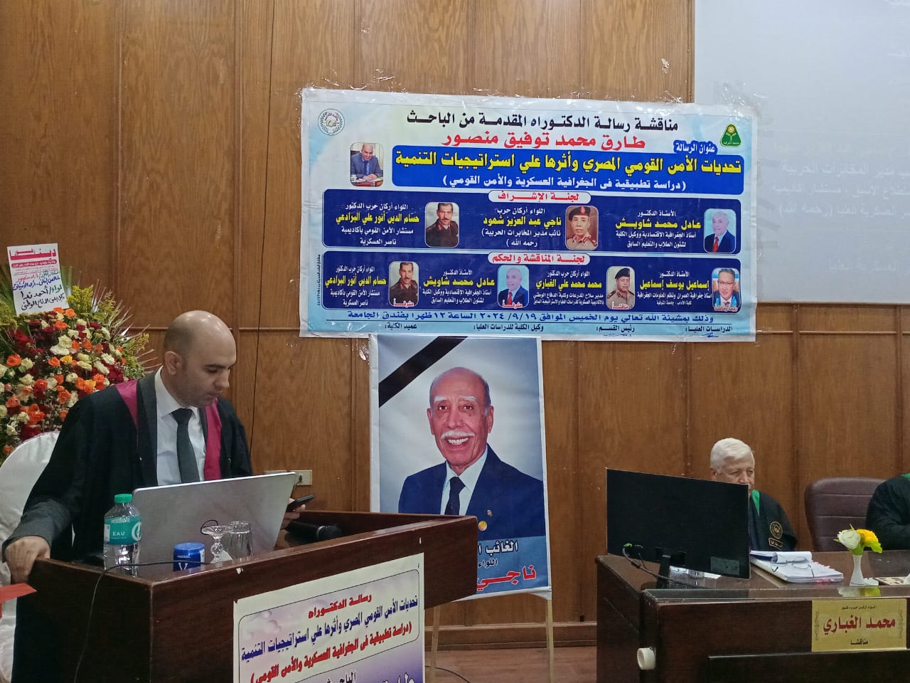 وتشمل رسالة الدكتوراه، تحديات الأمن القومي المصري وآثرها على استراجيات التنمية على دراسة تحليلية في الجغرافية العسكري والأمن القومي، حيث تم مناقشة الرسالة اليوم، في فندق جامعة المنوفية ولمدة 4 ساعات متواصلة.