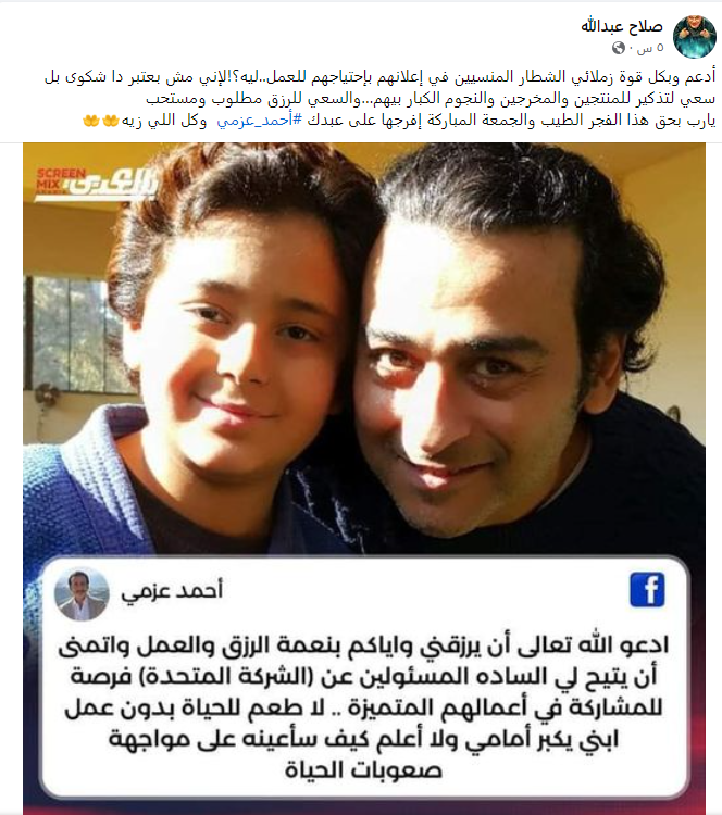 وكتب صلاح عبد الله عبر حسابها الشخصي بموقع فيسبوك: أدعم وبكل قوة زملائي الشطار المنسيين في إعلانهم باحتياجهم للعمل، ليه؟! لأني مش بعتبر دا شكوى بل سعي لتذكير للمنتجين والمخرجين والنجوم الكبار بيهم، السعي للرزق مطلوب ومستحب، يا رب بحق هذا الفجر الطيب والجمعة المباركة افرجها على عبدك أحمد عزمي، وكل اللي زيه.