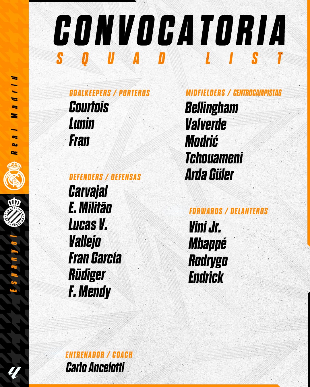 أعلن الإيطالي كارلو أنشيلوتي المدير الفني لفريق ريال مدريد قائمة لاعبيه لمواجهة إسبانيول، مساء غدٍ السبت، ضمن منافسات الدوري الإسباني الممتاز 2024-2025.