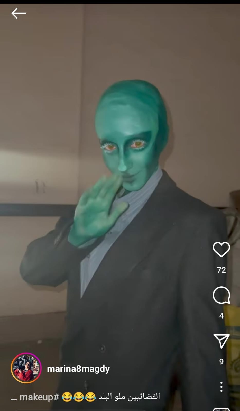 وتحدثت مارينا مجدي صاحبة الميكب السينمائي في تصريحات خاصة لـ القاهرة 24، عن تفاصيل ميكب الكائن الفضائي: من فترة قريبة فكرت أني أرجع للميكب السينمائي والحاجات اللي كنت بعملها من فترة، ولقيت إني بعمل ماسكات حلوة، قولت ليه منزلتش بيها الشارع وفعلا عملت كده وكنت بشوف أجانب كتير بتعمل كده.
