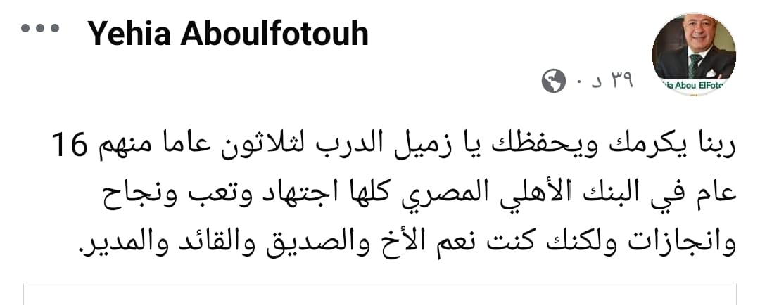وأوضح أبو الفتوح في تعليق له عبر صفحته الشخصية على موقع التواصل الاجتماعي فيسبوك: ربنا يكرمك ويحفظك يا زميل الدرب لثلاثون عامًا منهم 16 عامًا في البنك الأهلي المصري كلها اجتهاد وتعب ونجاح وإنجازات ولكنك كنت نعم الأخ والصديق والقائد والمدير.