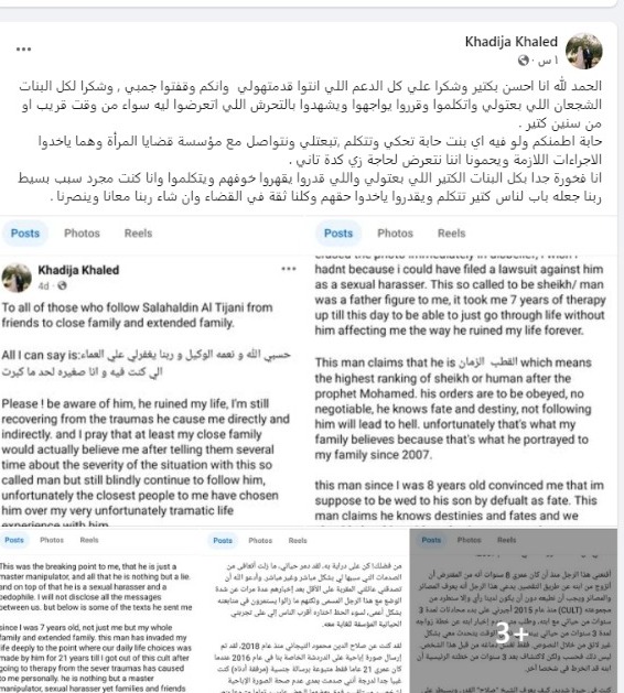 تقدمت خديجة خالد، صاحبة اتهام صلاح التيجاني، شيخ الطريقة التيجانية في مصر، بالتحرش، بالشكر لكل من دعمها خلال الأيام الماضية، في منشور لها على صفحتها الشخصية بموقع التواصل الاجتماعي «فيس بوك»، كأول تعليق منها بعد خضوع التيجاني للتحقيق من قبل جهات التحقيق المختصة، ومن ثم إخلاء سبيلة بكفالة مالية.