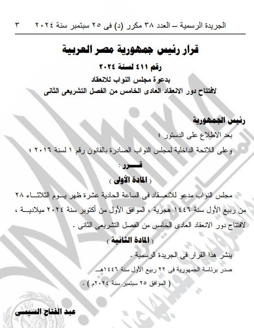 ونص قرار الرئيس السيسي على أن مجلس النواب مدعو للانعقاد في الساعة الحادية عشرة ظهر يوم الثلاثاء 28 من ربيع الأول سنة 1446 هجرية، الموافق الأول من أكتوبر سنة 2024 ميلادية، وافتتاح دور الانعقاد العادي الخامس من الفصل التشريعي الثاني.