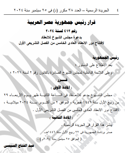 كما نص القرار، على أن مجلس الشيوخ مدعو للانعقاد في الساعة الثانية ظهر يوم الأربعاء 29 من ربيع الأول سنة1446 هجرية، الموافق 2 من أكتوبر سنة 2024 ميلادية، لافتتاح دور الانعقاد العادي الخامس من الفصل التشريعي الأول.