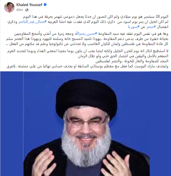أعرب المخرج خالد يوسف، عن حزنه الشديد بعد استشهاد حسن نصر الله الأمين العام لـ حزب الله اللبناني، وذلك بعد الغارة الإسرائيلية أمس.