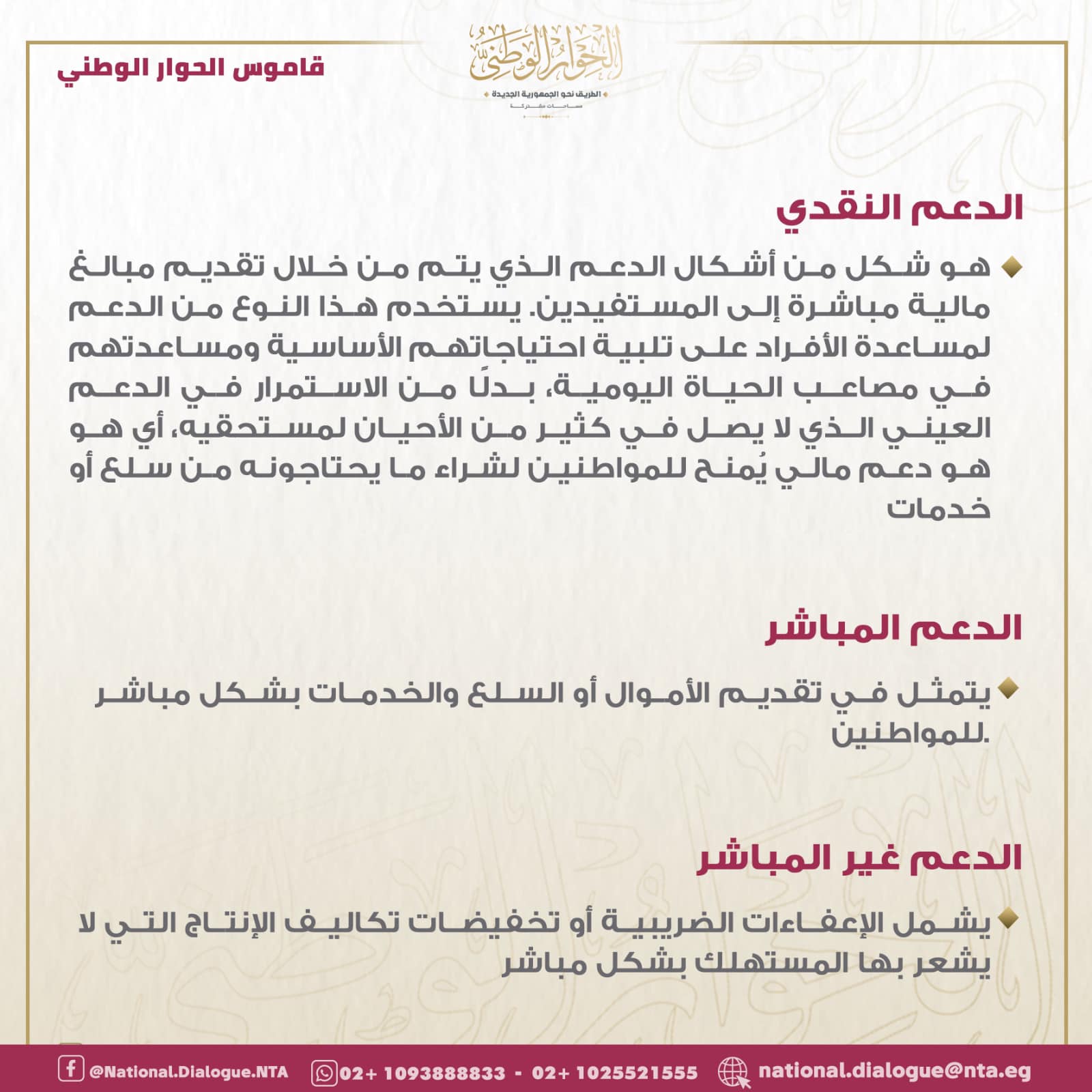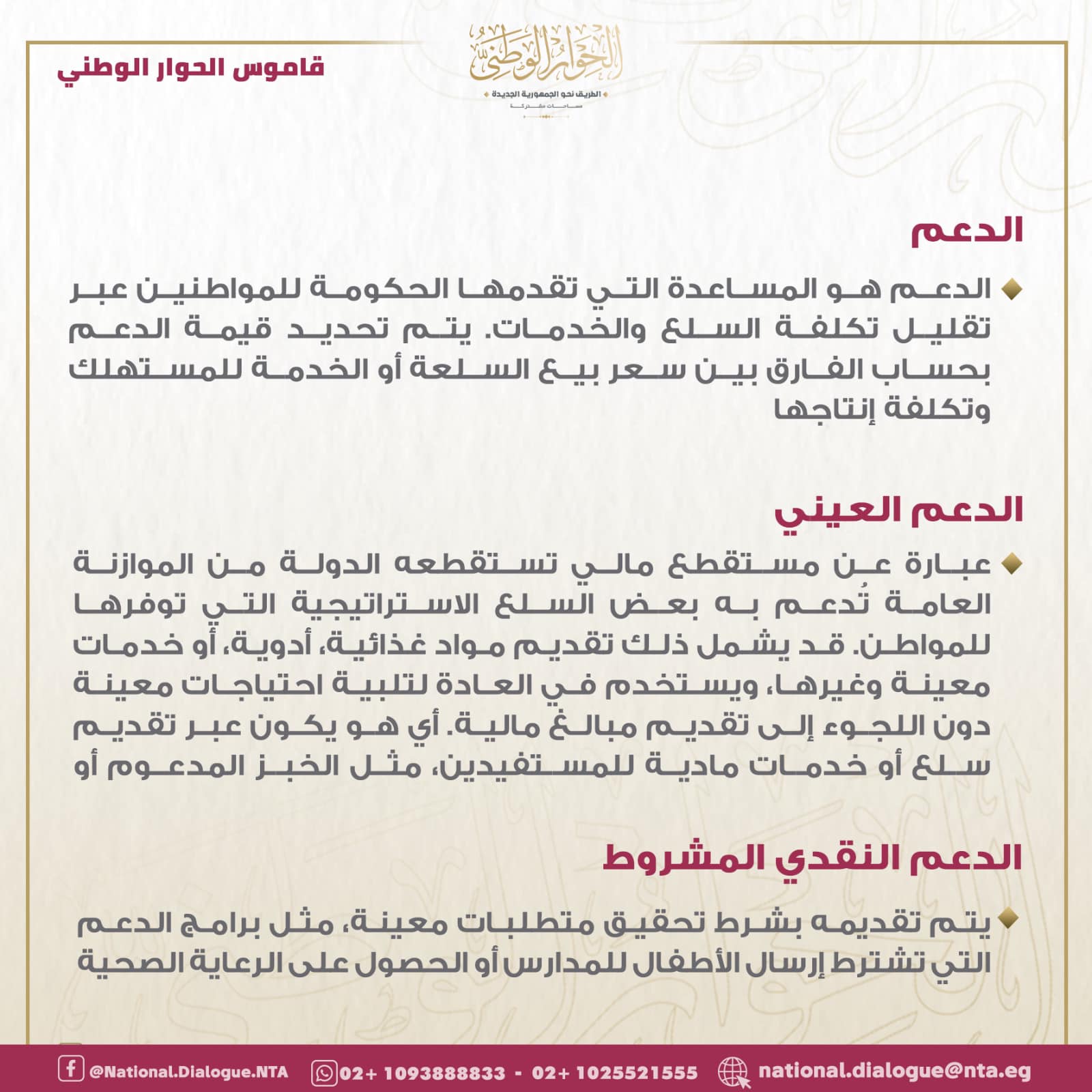 نشرت الصفحة الرسمية للحوار الوطني على فيسبوك قاموس الحوار الوطني؛ لتوضيح أبرز المفاهيم والمصطلحات المتداولة عن الدعم، وكيف تسهم هذه الأنماط في تحسين حياة المجتمعات.