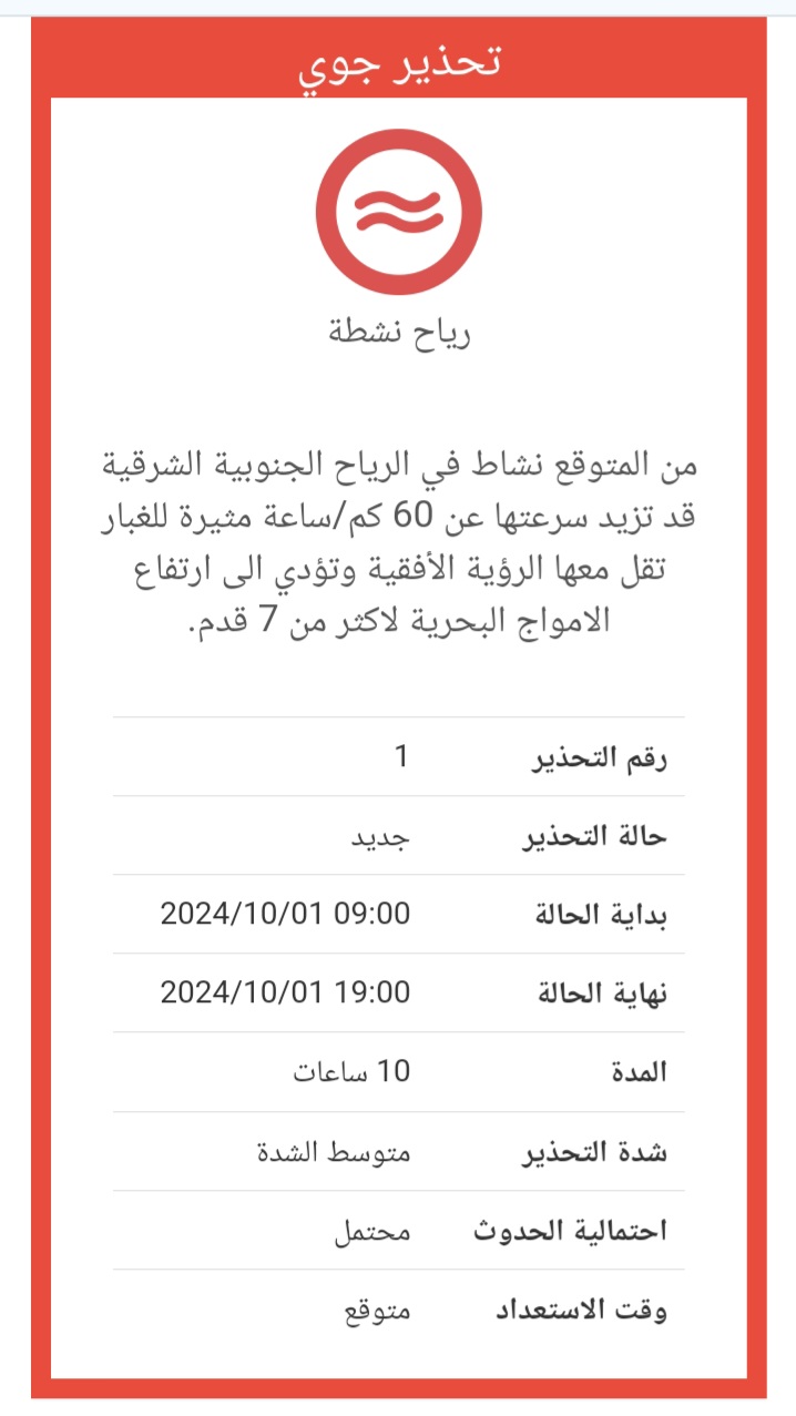 وفي بيانها حول طقس الكويت اليوم، توقعت الأرصاد الجوية نشاط في الرياح الجنوبية الشرقية قد تزيد سرعتها عن 60 كم/ساعة مثيرة للغبار تقل معها الرؤية الأفقية وتؤدي الى ارتفاع الامواج البحرية لاكثر من 7 قدم، وجاء التحذير باللون الأحمر وتفاصيله كالتالي: