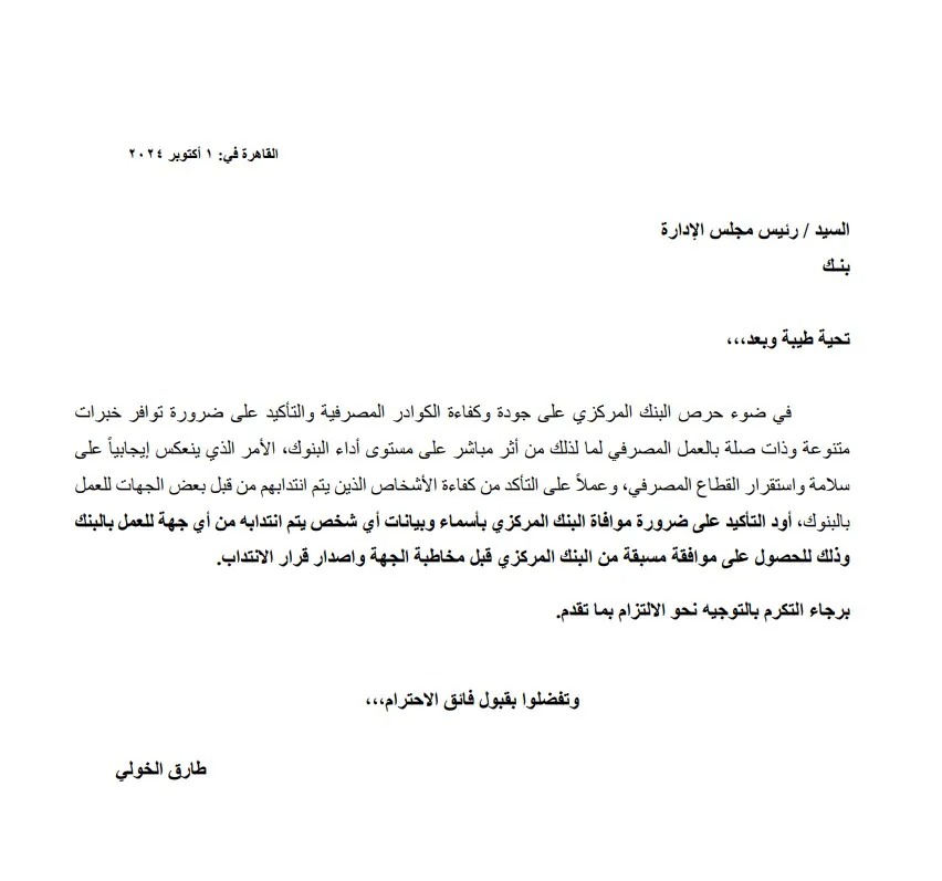 أكد البنك المركزي على ضرورة موافاة البنك المركزي بأسماء وبيانات أي شخص يتم انتدابه من أي جهة للعمل بالبنك، وذلك للحصول على موافقة مسبقة من البنك المركزي قبل مخاطبة الجهة وإصدار قرار الانتداب.