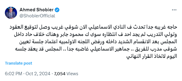 وكتب أحمد شوبير عبر حسابه الرسمي على منصة X: حاجة غريبة جدًا تحدث في النادي الإسماعيلي الآن شوقي غريب وصل لتوقيع العقود وتولي التدريب ولم يجد أحد في انتظاره سوى كابتن محمود جابر.