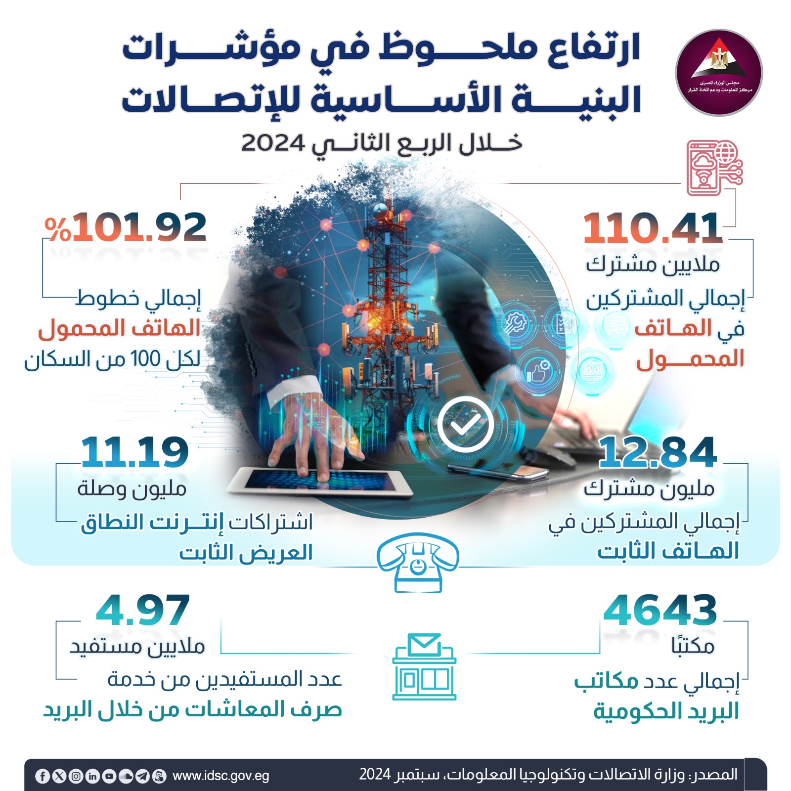 سلط مركز المعلومات ودعم اتخاذ القرار بمجلس الوزراء، الضوء على الارتفاع الملحوظ في مؤشرات البنية الأساسية للاتصالات خلال الربع الثاني عام 2024، لافتا أن إجمالي خطوط الهاتف المحمول لكل 100 من السكان بلغ 101%.