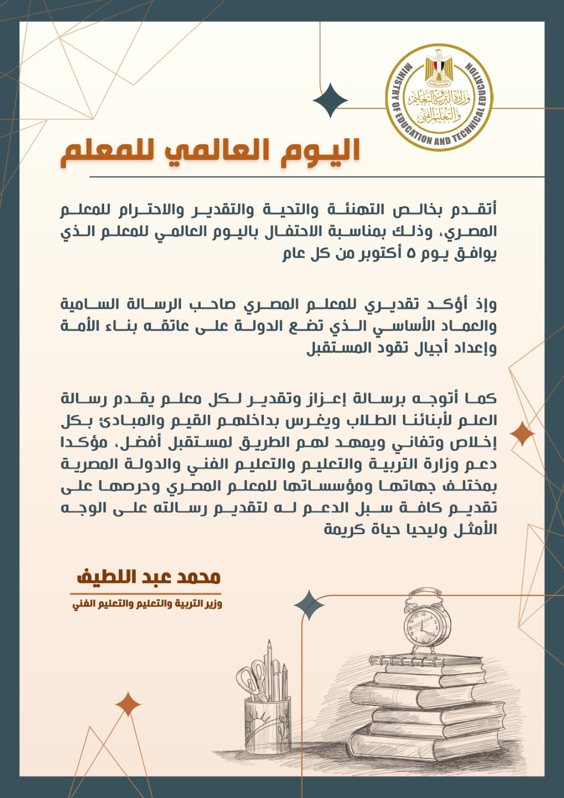 كما توجه الوزير برسالة إعزاز وتقدير لكل معلم يقدم رسالة العلم لأبنائنا الطلاب ويغرس بداخلهم القيم والمبادئ بكل إخلاص وتفاني ويمهد لهم الطريق لمستقبل أفضل، مؤكدًا دعم وزارة التربية والتعليم والتعليم الفني والدولة المصرية بمختلف جهاتها ومؤسساتها للمعلم المصري وحرصها على تقديم كافة سبل الدعم له لتقديم رسالته على الوجه الأمثل وليحيا حياة كريمة.