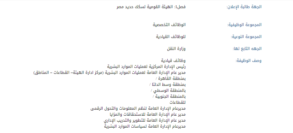 ومن جانبها كانت قد أعلنت الهيئة القومية لسكك حديد مصر عن حاجتها لعدد من العاملين في بعض الوظائف القيادية المتمثلة في: