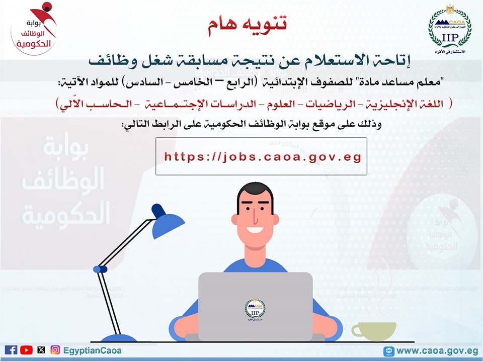 وقد أعلنت الصفحة الرسمية لـ الجهاز المركزي للتنظيم والإدارة بموقع فيس بوك، عن رابط الاستعلام عن نتيجة مسابقة التربية والتعليم بالرقم القومي 2024 من خلال بوابة الوظائف الحكومية عبر الرابط التالي http://jobs.caoa.gov.eg كما أوضح الجهاز المركزي أنه في حال فقد رقم الاستعلام يُمكن للمتقدم التواصل عبر البريد الإلكتروني التالي [email protected]، مع ضرورة كتابة المادة المتقدم لها وإرسال صورة البطاقة وجه وظهر.