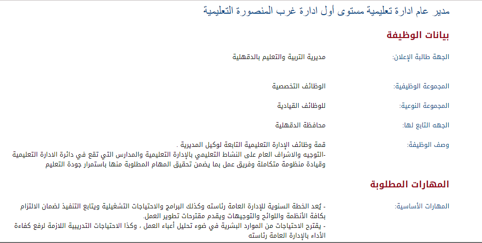 بعدما أوضحنا لكم تفاصيل الاستعلام عن مسابة التربية والتعليم بالرقم القومي 2024، يجب التنويه بأن هناك إعلانا آخر على بوابة الوظائف الحكومية الجهاز المركزي للتنظيم والإدارة، حيث تطلب مديرية التربية والتعليم بالدقهلية عاملين للوظائف التخصصية في التوجيه والاشراف العام على النشاط التعليمي بالإدارة التعليمية والمدارس التي تقع في محافظة الدقهلية.
