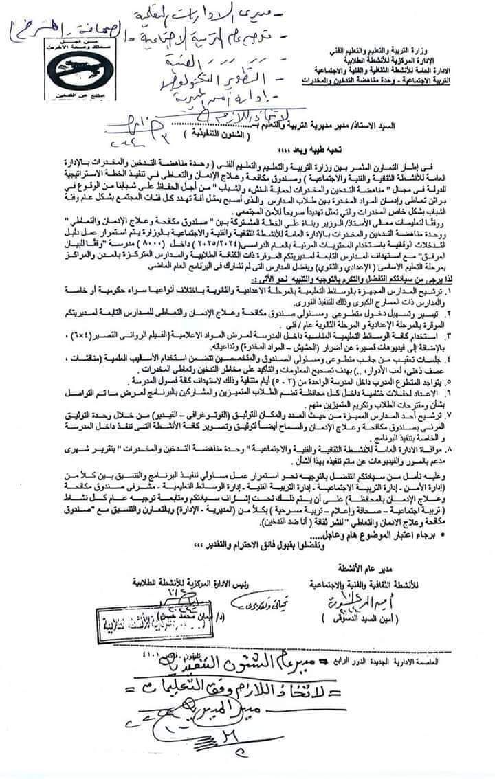 وجهت وزارة التربية والتعليم، خطابا للمديريات التعليمية، بشأن تنفيذ الخطة الاستراتيجية للدولة في مجال مناهضة التدخين والمخدرات لحماية النشء والشباب من أجل الحفاظ على شبابنا من الوقوع في براثن تعاطي وإدمان المواد المخدرة بين طلاب المدارس، والذي أصبح يمثل آلة تهدد كل فئات المجتمع بشكل عام وفئة الشباب بشكل خاص المخدرات والتي تمثل تهديدًا صريحًا للأمن المجتمعي.