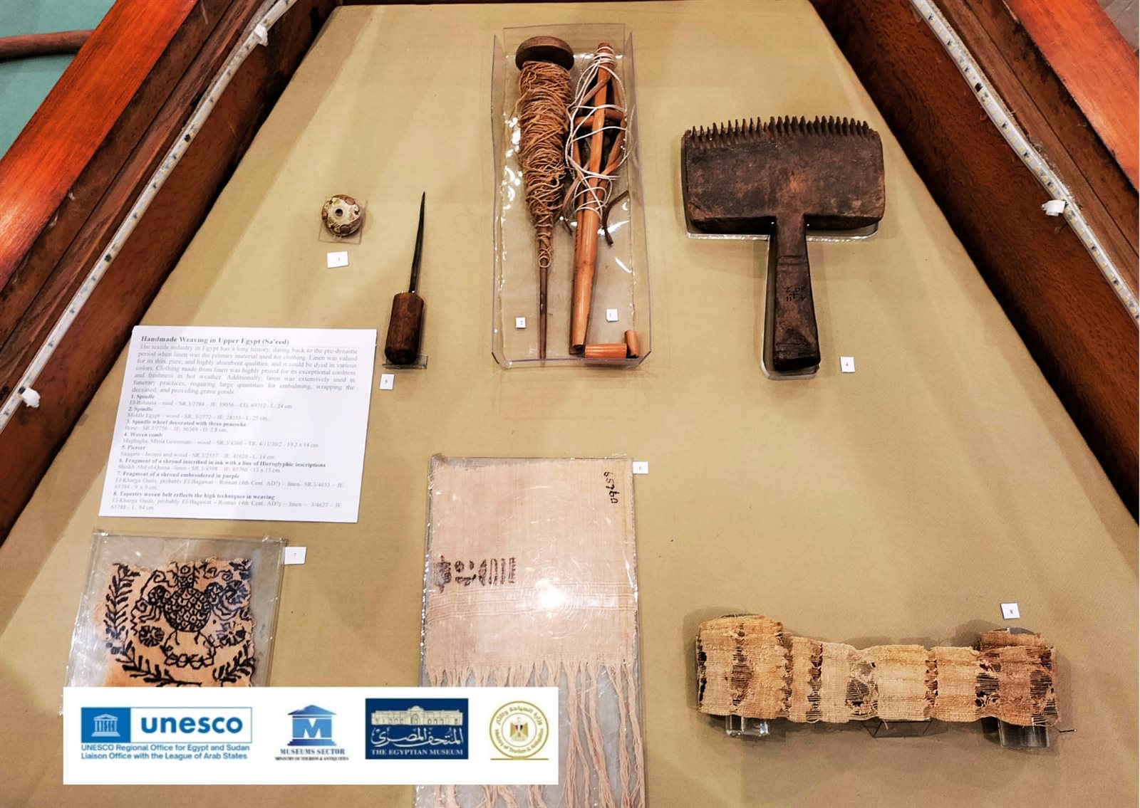 يعرض المتحف المصري بالتحرير، مجموعة من القطع الأثرية التى تستخدم خلال عملية النسيج مثل المغازل وأمشاط النسيج والمخارز وأجزاء من أكفان ومنسوجات تعود إلى حفائر متنوعة وعصور زمنية مختلفة.