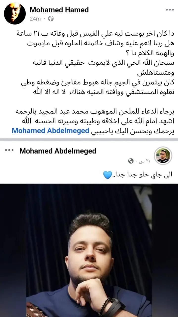 وأردف: لا إله إلا الله، برجاء الدعاء للملحن الموهوب محمد عبد المجيد بالرحمة، أشهد أمام الله على أخلاقه، وطيبته وسيرته الحسنة، الله يرحمك ويحسن إليك يا حبيبي.