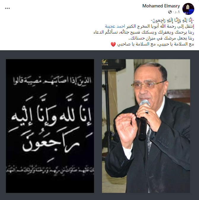 توفي منذ قليل المخرج أحمد عجيبة، مخرج مسارح الأقاليم، وأعلن أحد أصدقائه وفاته عبر فيسبوك قائلا: إنا لله وإنا إليه راجعون، انتقل إلى رحمة الله أبويا المخرج الكبير أحمد عجيبة، ربنا يرحمك ويغفر لك ويسكنك فسيح جناته، نسألكم الدعاء، ربنا يجعل مرضك في ميزان حسناتك، مع السلامة يا حبيبي، مع السلامة يا صاحبي.