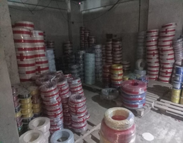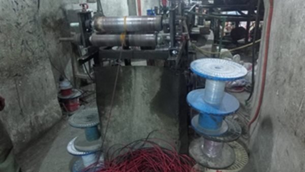 وعُثر بداخل المصنع على كمية كبيرة من الأسلاك منتج نهائي تحت التجهيز وكمية من خامات التصنيع والأدوات المستخدمة في التصنيع.