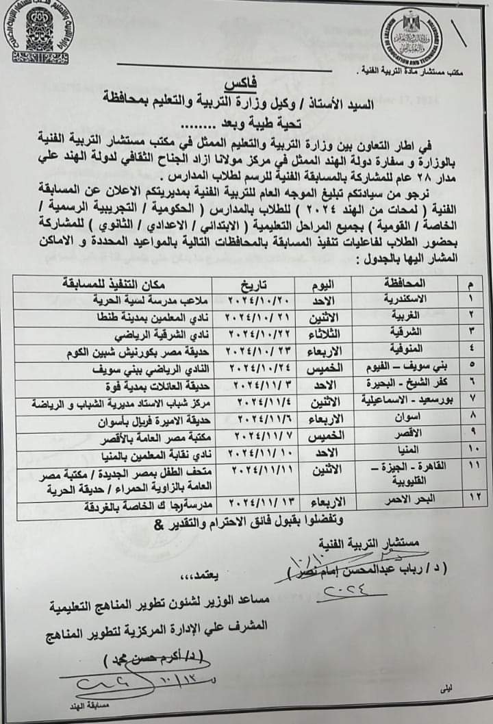ووجهت الوزارة، المديريات، بإبلاغ الموجه العام للتربية الفنية بكل مديرية بالإعلان عن المسابقة الفنية (لمحات من الهند 2024 ) للطلاب بالمدارس (الحكومية / التجريبية الرسمية / الخاصة / القومية) بجميع المراحل التعليمية (الابتدائي / الإعدادي / الثانوي) للمشاركة بحضور الطلاب لفعاليات تنفيذ المسابقة بالمحافظات التالية بالمواعيد المحددة والأماكن كالآتي: