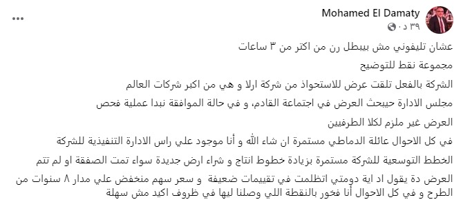 وأضاف الدماطي عبر حسابه الشخصي على موقع التواصل الاجتماعي فيسبوك، أن مجلس إدارة دومتي سيبحث عرض آرلا فوودز الدنماركية، خلال اجتماعه المقبل.