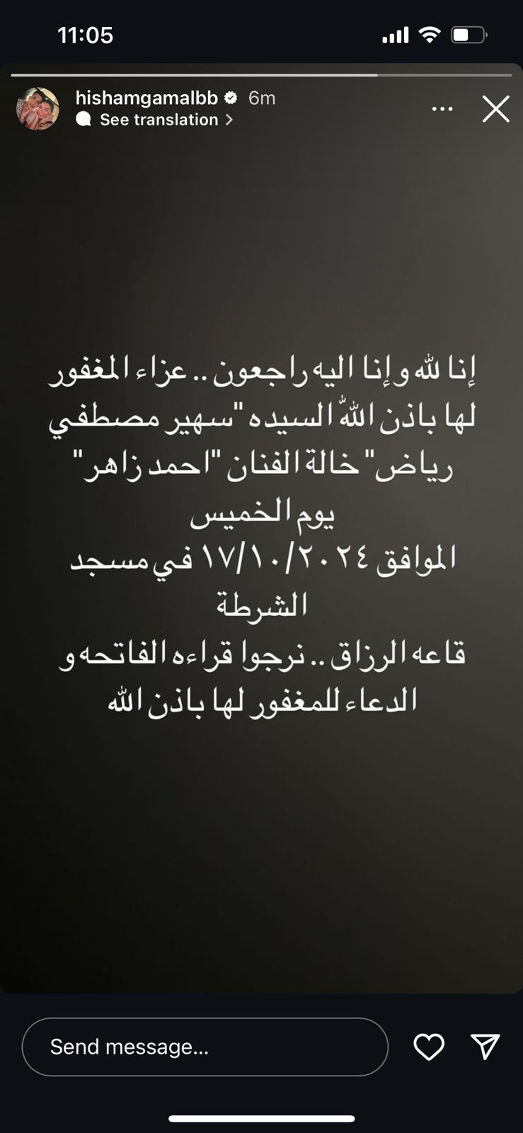 ونشر الفنان هشام جمال استوري عبر حسابه الخاص على موقع التواصل الاجتماعي إنستجرام قائلًا: إنا لله وإنا إليه راجعون.. عزاء المغفور لها بإذن الله السيدة سهير مصطفى يوم الخميس القادم 17 من الشهر الحالي بمسجد الشرطة قاعة الرزاق.