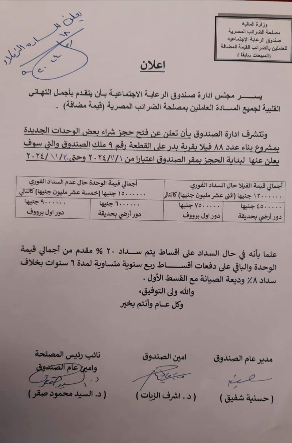 وبحسب المستند المرفق بمنشور النائب عبر صفحته على فيسبوك فقد جاء فيه: يُسر مجلس إدارة صندوق الرعاية الاجتماعية للعاملين بالضرائب بأن يتقدم بأجمل التهاني القلبية لجميع العاملين بمصلحة الضرائب المصرية قيمة مضافة، وتتشرف إدارة الصندوق بأن تعلن فتح حجز شراء بعض الوحدات الجديدة بمشروع بناء عدد 88 فيلا بقرية بدر على القطعة رقم 9 ملك الصندوق والتي سوف يعلن عنها لبداية الحجز بمقر الصندوق اعتبارا من 2024/11/1 وحتى 30 /11 / 2024.