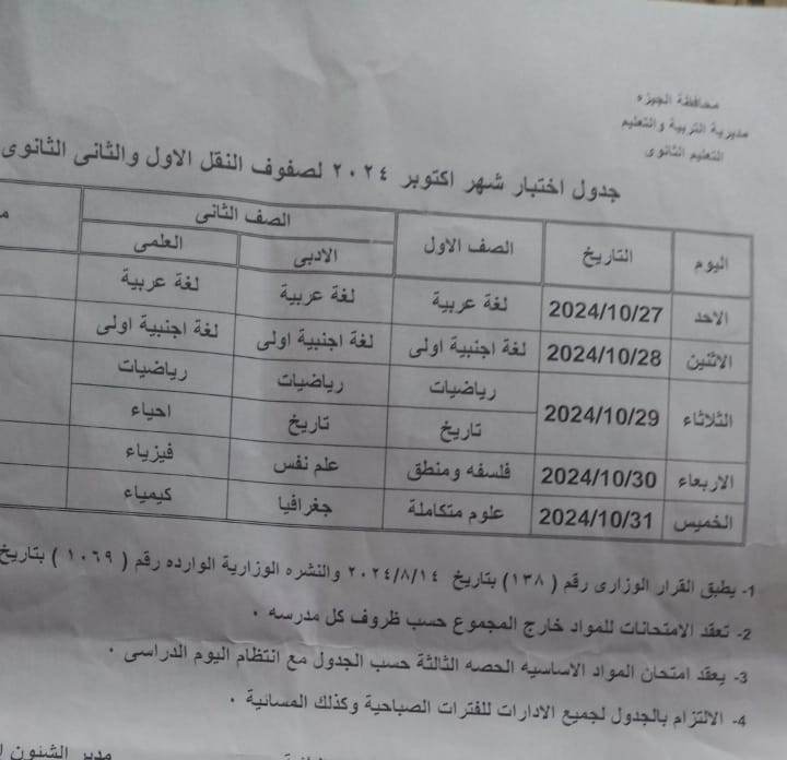جداول امتحانات شهر أكتوبر بمحافظة الجيزة لـ طلاب النقل