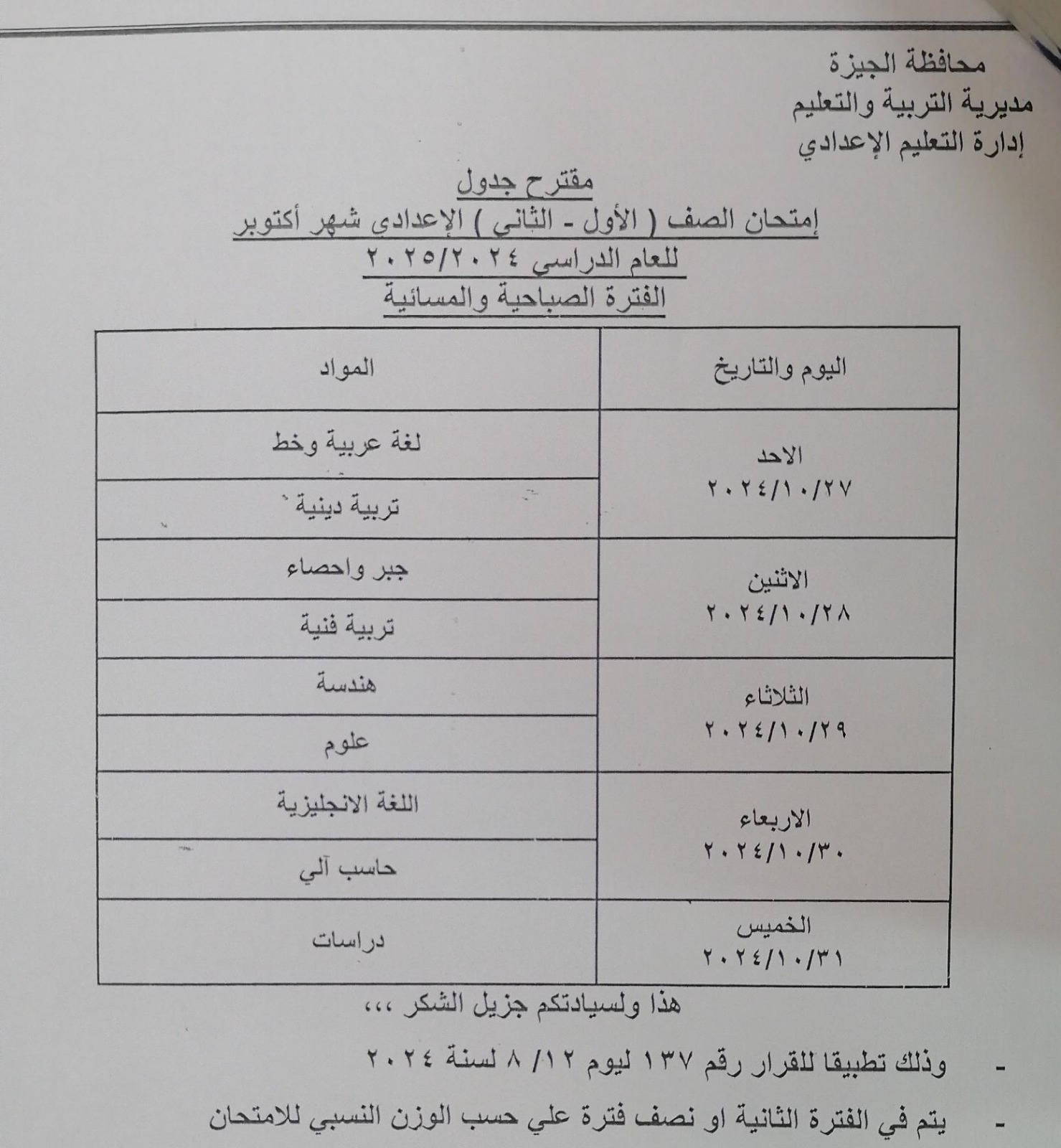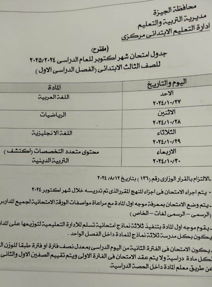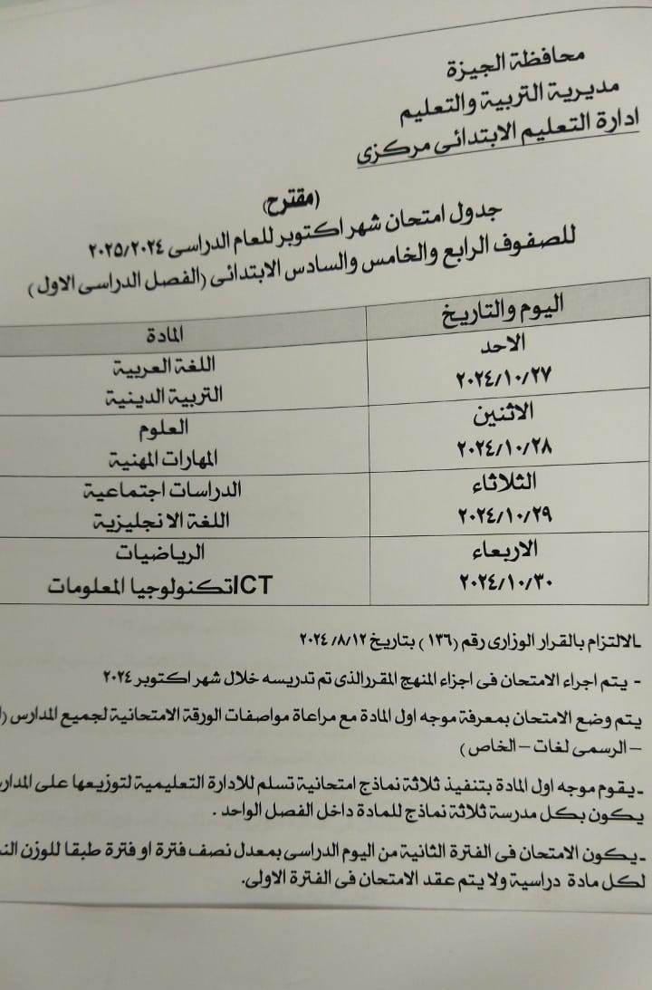 وجاءت جداول امتحانات شهر أكتوبر بمحافظة الجيزة كالاتي: