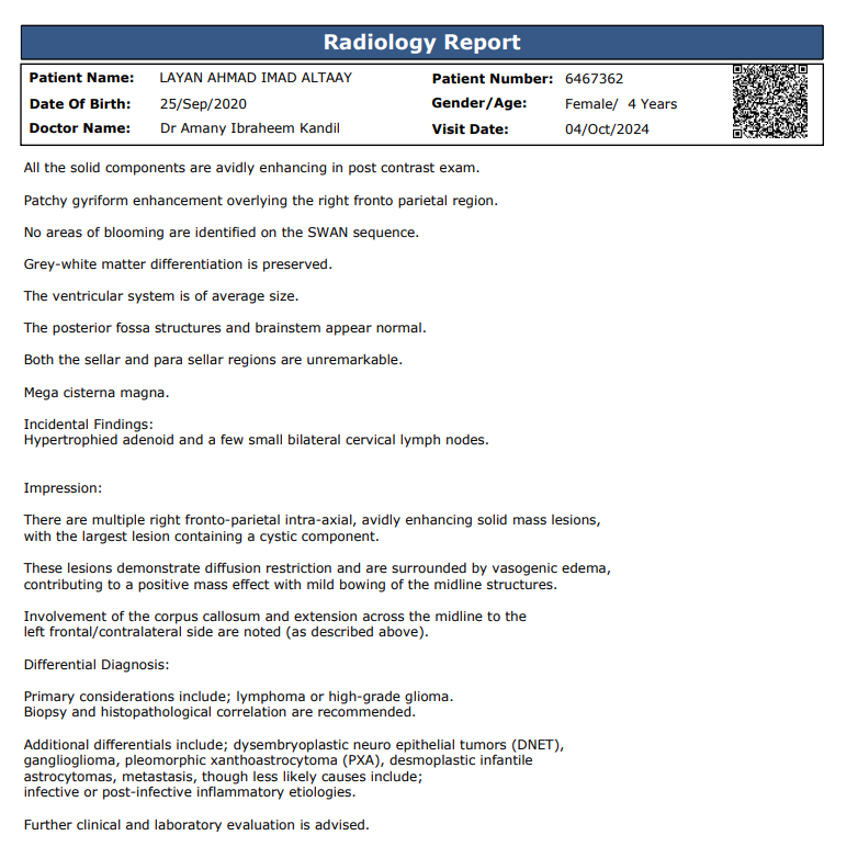وأوضحت التقارير الطبية الخاصة بـ الطفلة ليان أحمد عماد الطائي بـ الفحوصات الأولية والتصوير بالرنين المغناطيسي للدماغ أنها تعاني من وجود كتلة في الدماغ يُشتبه في أنها ورم دبقي عالي الدرجة، وتلقت علاجًا بـ المضادات الحيوية ومضادات الفيروسات بعد استبعاد التهاب السحايا والتهاب الدماغ، لكن لم يكن هناك أي تاريخ لنوبات أو حالات عصبية سابقة في سجلاتها.