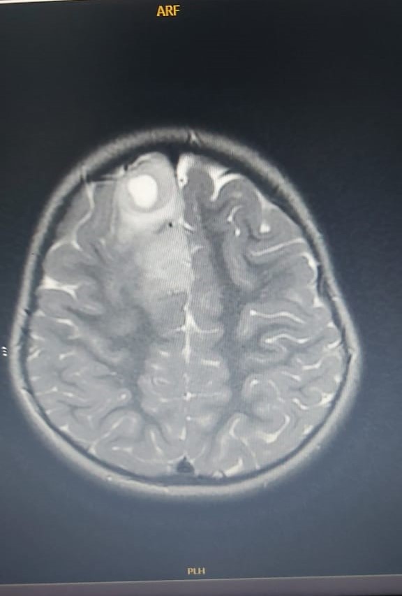 وحسب ما نُشر في التقرير الطبي، أظهرت الأشعات بالرنين المغناطيسي للدماغ وجود كتلة داخل قشرية في الفص الجبهي الأيمن بحجم 3×2×1.7 سم، تحتوي على مكونات نخرية، وتظهر إشارات منخفضة على T1WI وإشارات عالية على T2WI، إذ إن هناك وذمة محيطة تسبب تأثيرًا ضاغطًا مع إزاحة الهياكل الدماغية.