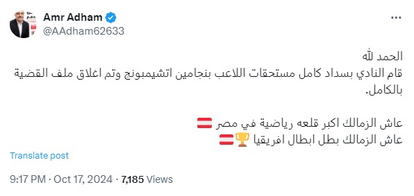 وكتب عمرو أدهم عبر حسابه الرسمي على منصة x: الحمد لله.. قام النادي بسداد كامل مستحقات اللاعب بنجامين أشيمبونج وتم اغلاق ملف القضية بالكامل.