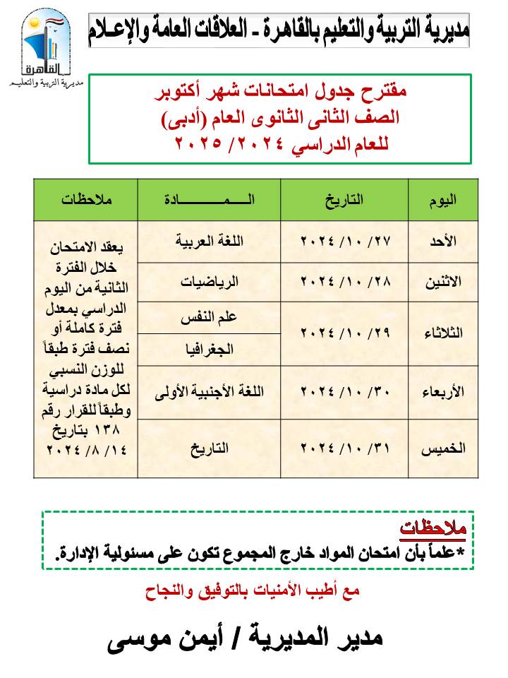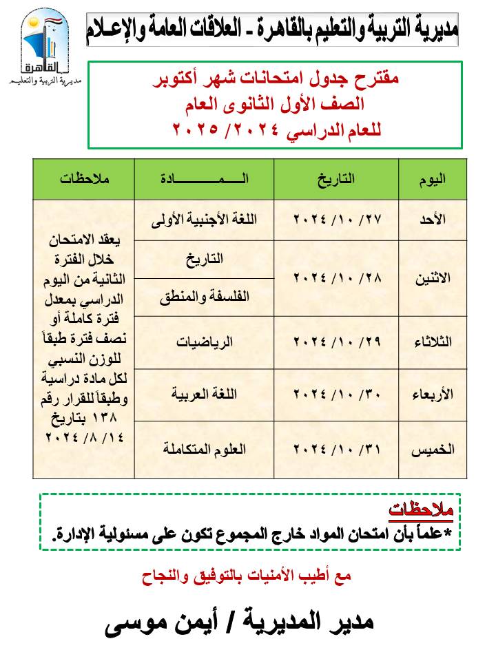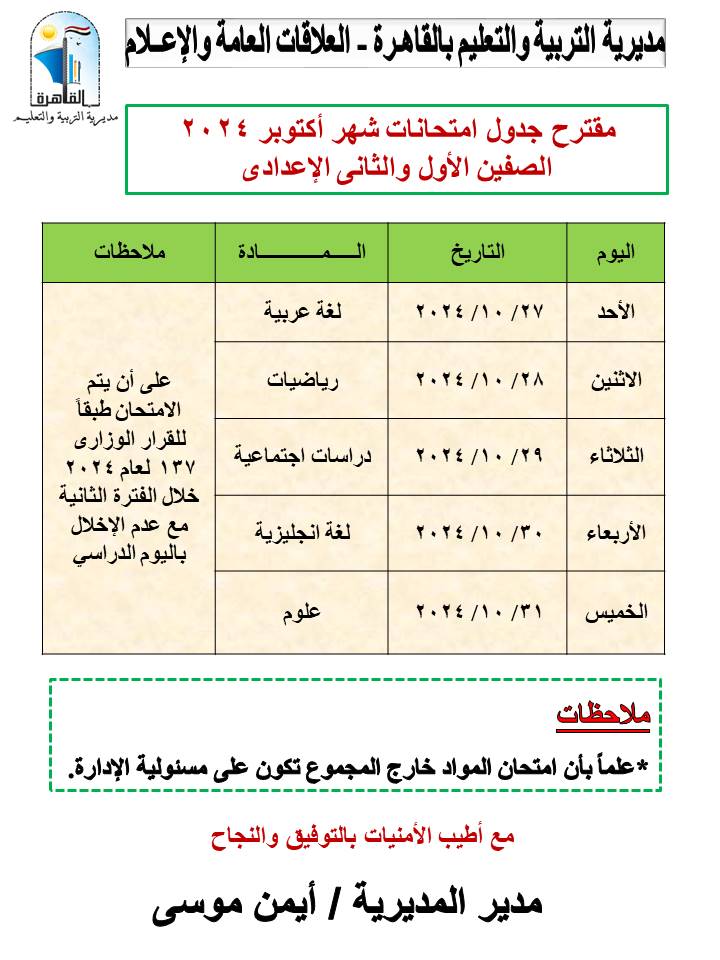أعلنت مديرية التربية والتعليم بالقاهرة برعاية أيمن موسى، وكيل أول الوزارة، جداول امتحانات شهر أكتوبر للعام الدراسي 2024-2025 للمراحل التعليمية الثلاثة ابتدائى - إعدادي – ثانوي، وذلك اعتبارًا من يوم الأحد الموافق 27-10-2024 حتى يوم الخميس 31-10-2024.