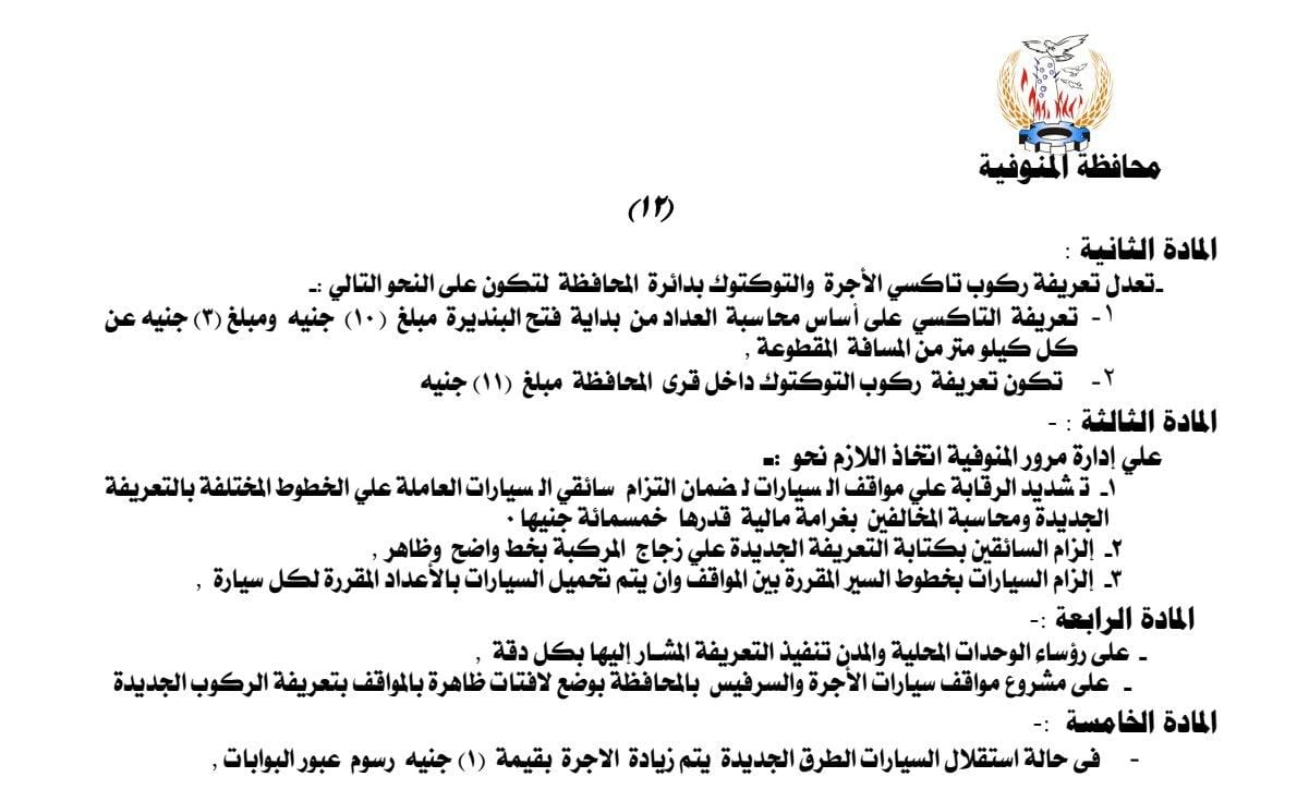 هذا وتضمنت المادة الثانية من القرار تعديل تعريفة ركوب تاكسي الأجرة 10 جنيهات على أساس محاسبة العداد من بداية فتح البنديرة ومبلغ 3 جنيهات عن كل 1 كيلو متر من المسافة المقطوعة، و11 جنيها تعريفة الركوب الجديدة لمركبات التوك توك داخل قرى المحافظة.