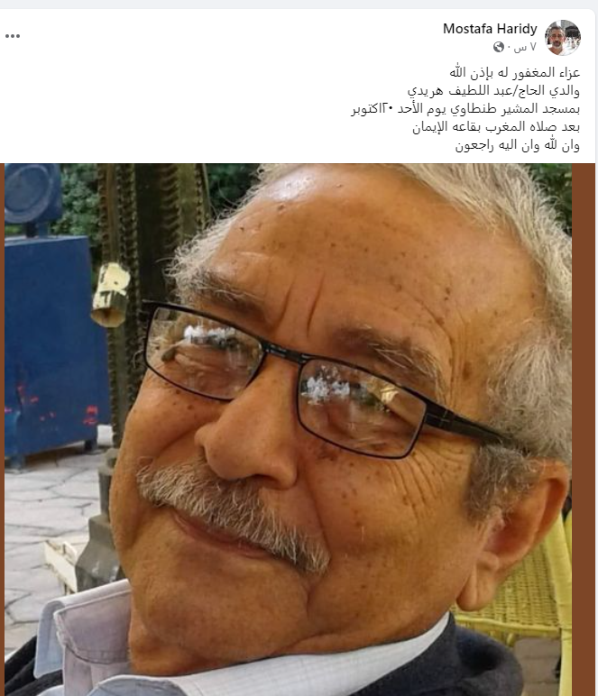 ونشر مصطفى هريدي عبر حسابه الشخصي على فيسبوك، موعد ومكان عزاء والده، حيث كتب: عزاء المغفور له بإذن الله والدي الحاج عبد اللطيف هريدي، بمسجد المشير طنطاوي يوم الأحد 20 أكتوبر، بعد صلاه المغرب بقاعة الإيمان، وإنا لله وإنا إليه راجعون.