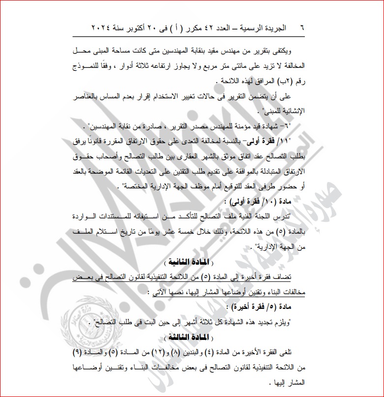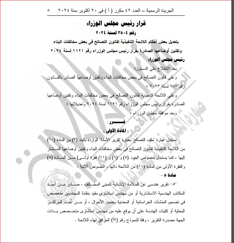 وجاءت أبرز التعديلات المنشورة في الجريدة الرسمية: تستبدل عبارة ملف التصالح بعبارة تقرير الأمانة الواردة بالبند 3 من المادة 10 من اللائحة التنفيذية لقانون التصالح في بعض مخالفات البناء وتقنين أوضاعها المشار إليها، كما يستبدل بنصوص البنود 5، 6، 11 من المادة 5 والفقرة الأولى من المادة 10 من اللائحة ذاتها والنصوص الآتية: تقرير هندسي عن السلامة الإنشائية للمبنى المخالف، صادر من أحد المكاتب الهندسية الاستشارية أو من مهندس استشاري مقيد بنقابة المهندسين متخصصي تصميم المنشآت الخراسانية أو المعدنية بحسب الأحوال، أو من أحد المراكز البحثية أو كليات الهندسة على أن يوقع عليه من مهندس استشاري متخصص بذات الجهة مصدرة التقرير، وفقا للنموذج رقم 12 المرافق لهذه اللائحة.