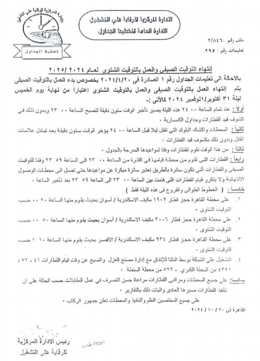 التوقيت الشتوي.. تعليمات جديدة من هيئة السكة الحديد│ مستند