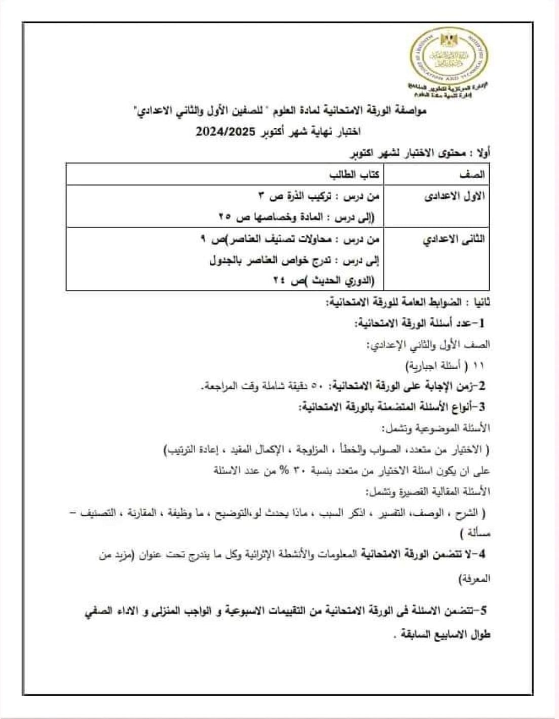مواصفات الورقة الامتحانية لمادة العلوم للصفين الأول والثاني الإعدادي لامتحان شهر أكتوبر