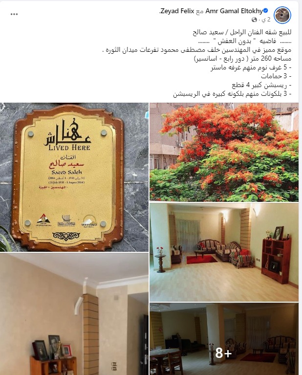 ونشر المكتب عبر الفيس بوك، وصاحبه الذي يدعى عمر جمال الطوخي مجموعة من الصور للشقة، وبها لوحة معدنية تحمل اسم الراحل سعيد صالح.