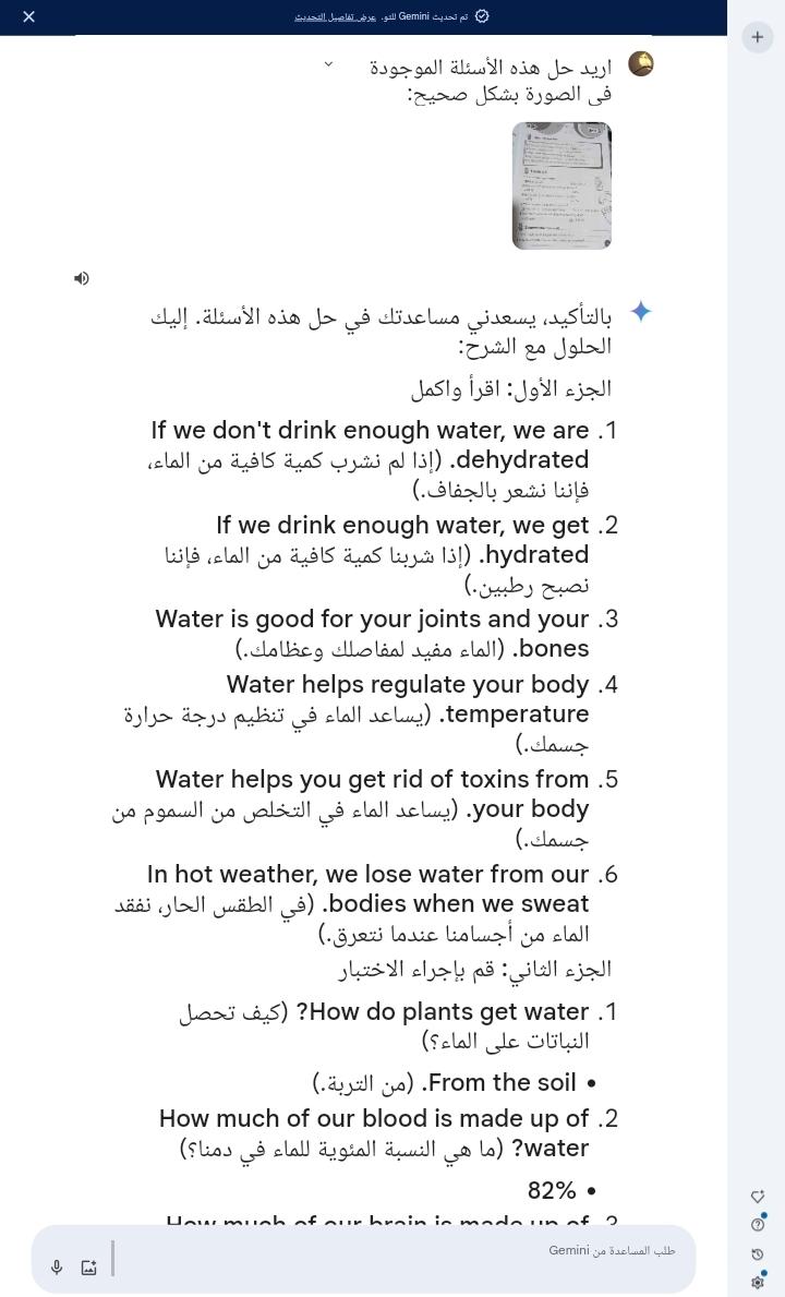 ويمكن لولي الامر الاستعانة بخدمة gemini من جوجل في حل الأسئلة المتعثرة أو غير المفهومة في المنهج سواء للواجبات المدرسية أو التقييمات الأسبوعية من خلال التسجيل على التطبيق باستخدام البريد الإلكتروني ثم فتح دردشة gemini وطرح السؤال والحصول على الإجابة فورًا كما توضح الصورة التالية: