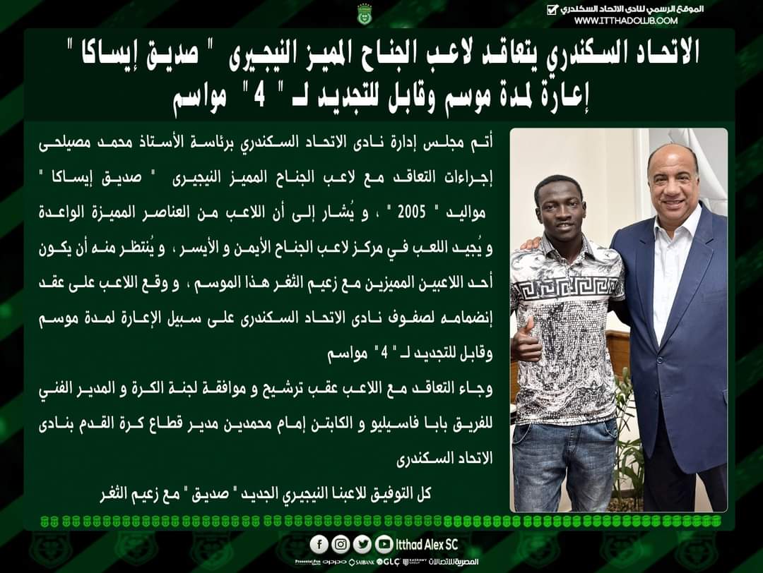 وجاء بيان النادي السكندري كالتالي: أتم مجلس إدارة نادي الاتحاد السكندري برئاسة محمد مصيلحي إجراءات التعاقد مع لاعب الجناح المميز النيجيري صديق إيساكا مواليد 2005.