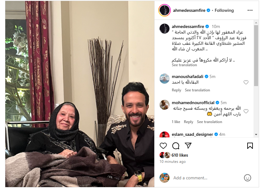 وأعلن الفنان أحمد عصام، موعد عزاء والدته الراحلة، وذلك عبر منشور على موقع تبادل الصور والفيديوهات إنستجرام، قائلا: عزاء المغفور لها بإذن الله والدتي الحاجة فوزية عبد الرؤوف، يوم الأحد 27 أكتوبر بمسجد المشير طنطاوي القاعة الكبيرة عقب صلاة المغرب ان شاء الله