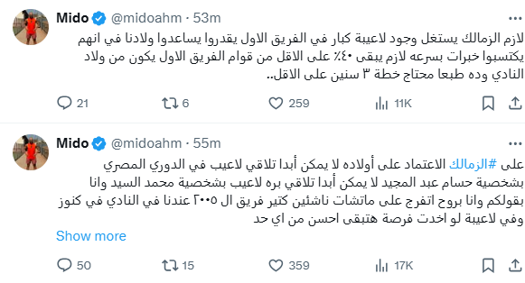 كتب ميدو عبر حسابه الرسمي على موقع إكس: على الزمالك الاعتماد على أولاده، لا يمكن أبدًا تلاقي لاعب في الدوري المصري بشخصية حسام عبد المجيد، لا يمكن أبدا تلاقي بره لاعب بشخصية محمد السيد.