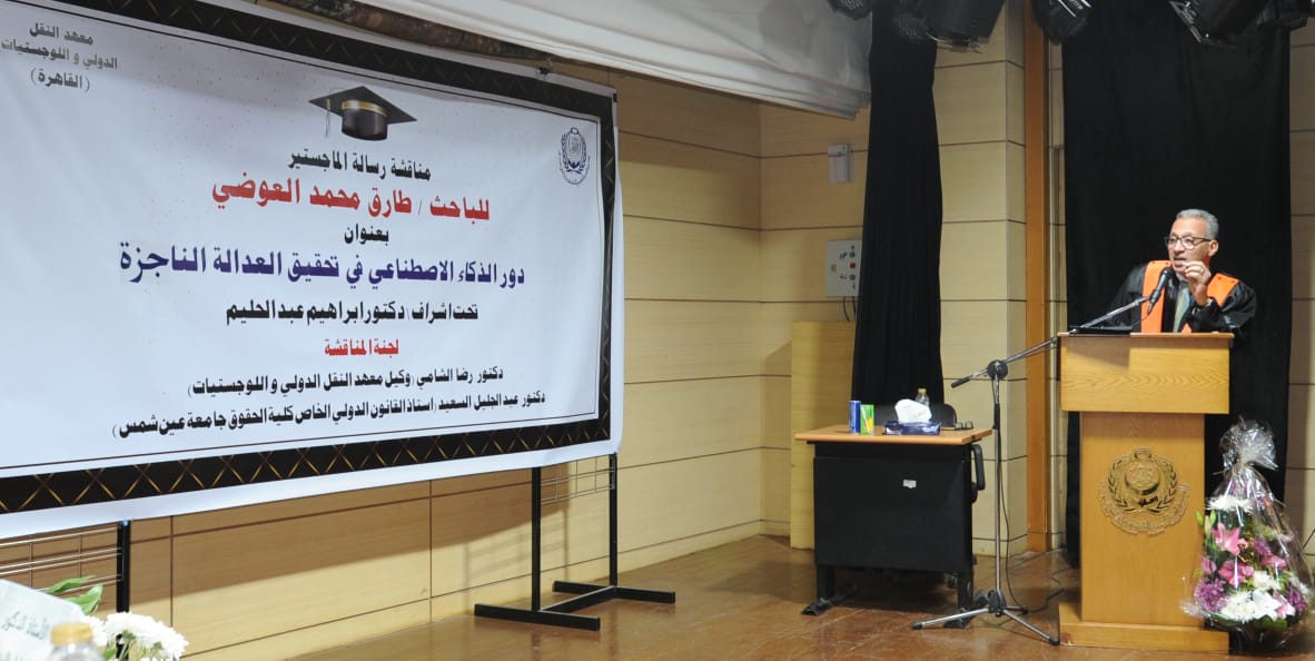 وتشكلت لجنة المناقشة من الدكتور رضا الشامي، وكيل معهد النقل الدولي واللوجستيات، والدكتور عبدالجليل السعيد، أستاذ القانون الدولي الخاص بكلية الحقوق بجامعة عين شمس، حيث ناقشت اللجنة فصول الرسالة وتطبيقاتها العملية في مجالات القضاء والتحكيم، مؤكدةً على أهمية توظيف الذكاء الاصطناعي في خدمة العدالة وتطوير النظام القضائي بما يتماشى مع التطورات العالمية في هذا المجال.