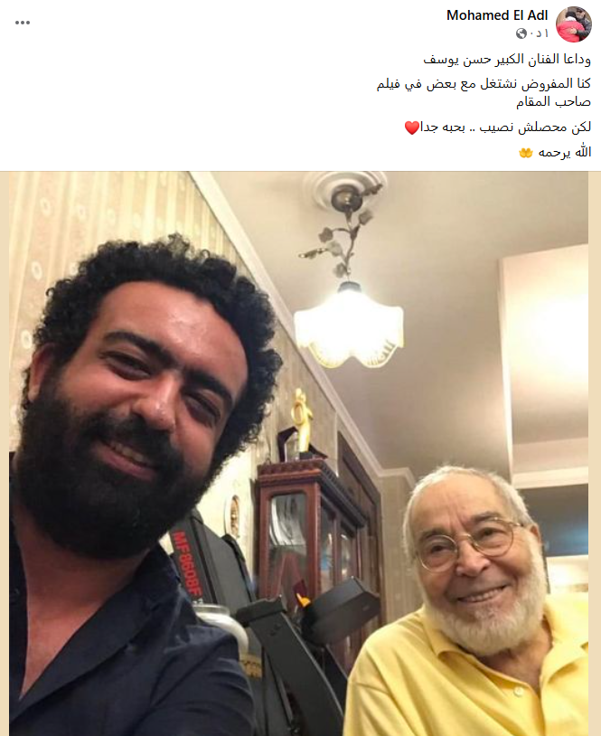 وكتب محمد العدل منشورًا، عبر حسابه الشخصي بموقع التواصل الاجتماعي فيس بوك، قال فيه: وداعًا الفنان الكبير حسن يوسف، كنا المفروض نشتغل مع بعض في فيلم صاحب المقام، لكن محصلش نصيب.. بحبه جدًا الله يرحمه.
