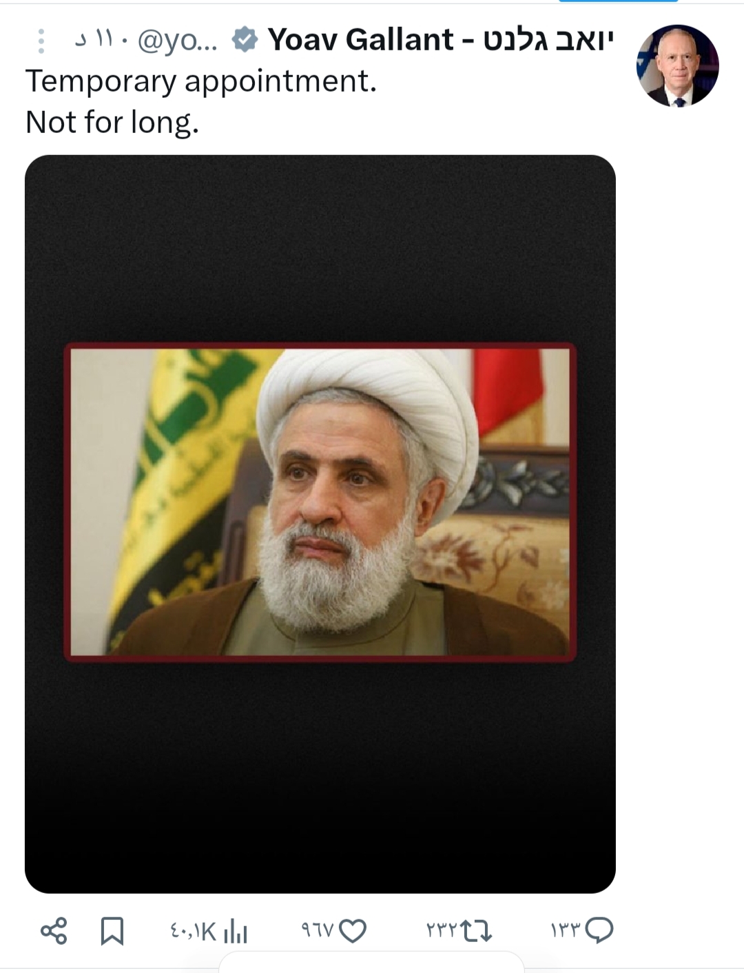 نشر وزير الدفاع الإسرائيلي يوآف جالانت، صورة للأمين العام لحزب الله نعيم قاسم، عبر منصة إكس مرفقًا الصورة بعبارة: تعيين مؤقت ليس لفترة طويلة، بدأ العد التنازلي.